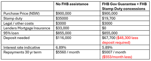 In NSW the stamp duty exemptions and government guarantee scheme combined can mean a savings of over $50K to first home buyers!! The sweet spot in Sydney / NSW major regional is under $800,000 as then no stamp duty would apply but is also very useful up to the $900,000 where partial stamp duty is payable but the government guarantee scheme still applies in metro areas.