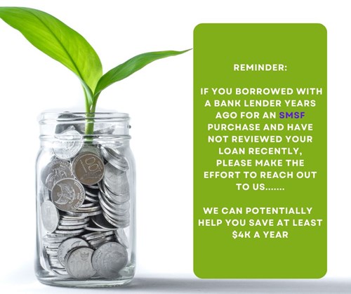 If you borrowed with a bank lender years ago for an SMSF purchase and have not reviewed your loan recently, please make the effort to reach out to us. You could save yourself over 1.5% pa in interest. On a typical $400K loan that equates to $6,000 pa. The other great thing is the changeover complexity and cost has also been greatly reduced.