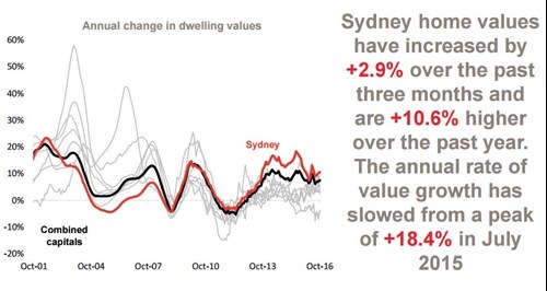 Next year’s property market in Sydney is all about what happens with interest rates. Lenders have already this week lifted some rates and I expect that to continue in 2017. If the RBA moves up next year that will be a signal to the market that rates bottomed in 2016 and that the party is over. Our prediction however is that there will be no change from the RBA. Lenders though will increase both owner occupied and investment loan rates over the next 12 months by around 0.4% pa. Investment rates will rise by a larger degree with the spread between the two ending up at a 0.50%-0.75% pa differential. With that in mind we predict a 5% increase in property prices in 2017 in Sydney.